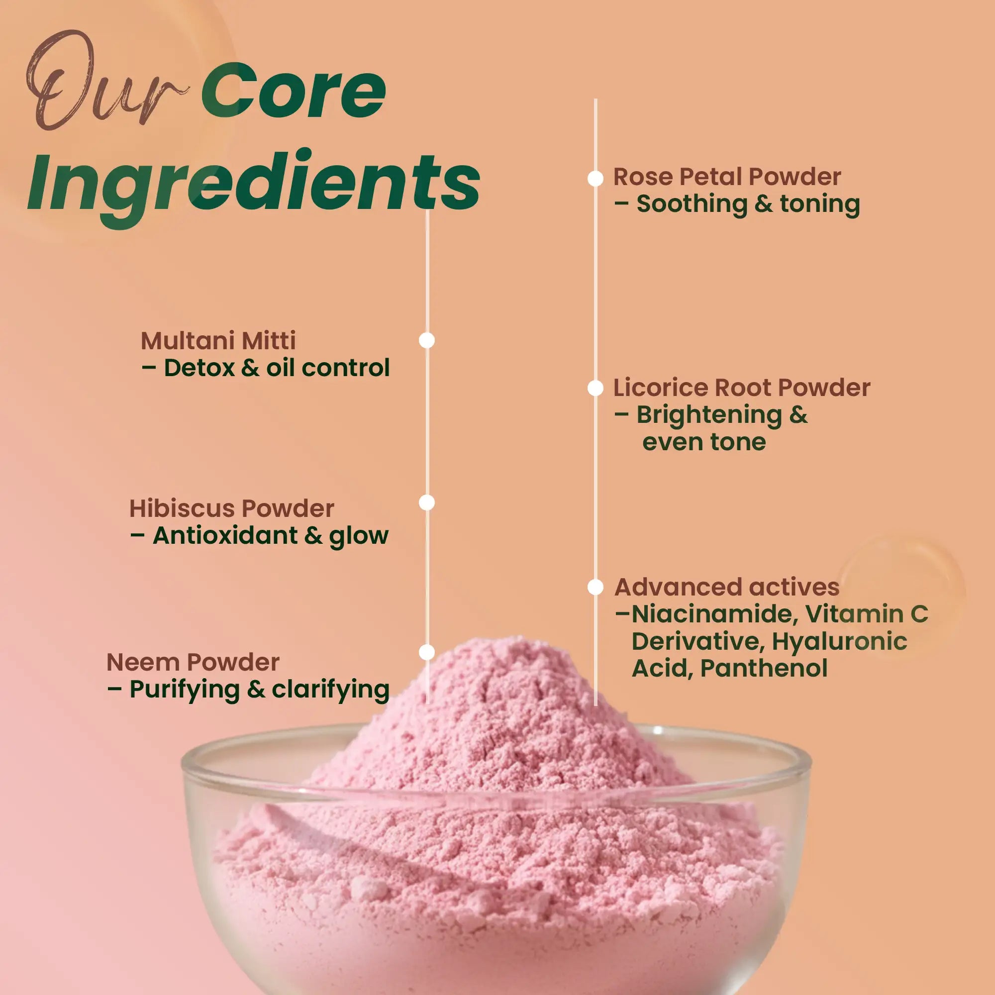 Multani Mitti • Rose Petal Powder • Hibiscus Powder • Neem Powder • Licorice Root • Niacinamide • Vitamin C • Hyaluronic Acid • Panthenol